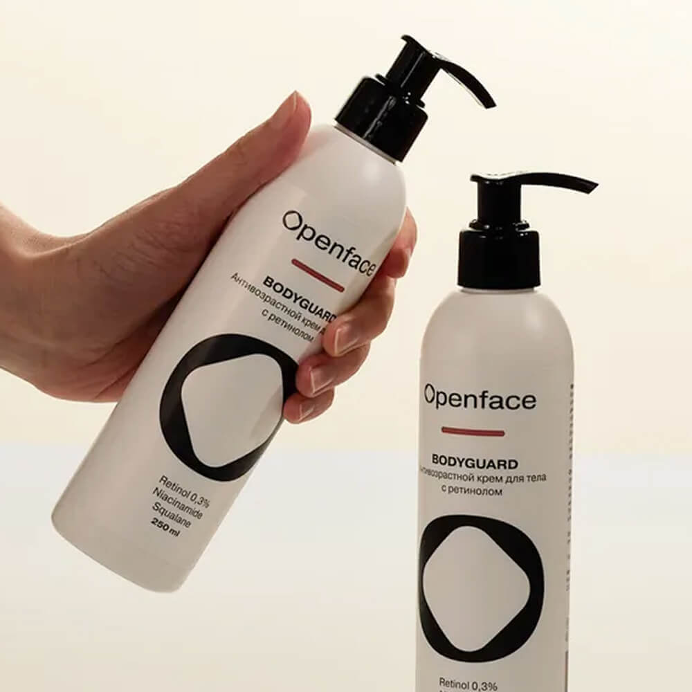 Антивозрастной крем для тела с ретинолом Openface Bodyguard способствует разглаживанию морщин и заломов, осветляет гиперпигментацию и препятствует её появлению Запускает регенерацию, стимулирует синтез коллагена, повышает эластичность. Деликатно отшелушивает и смягчает огрубевшие участки, выравнивает текстуру кожи. Содержит ретинол (0,3%), сквалан, токоферол, масло подсолнечника и ниацинамид.