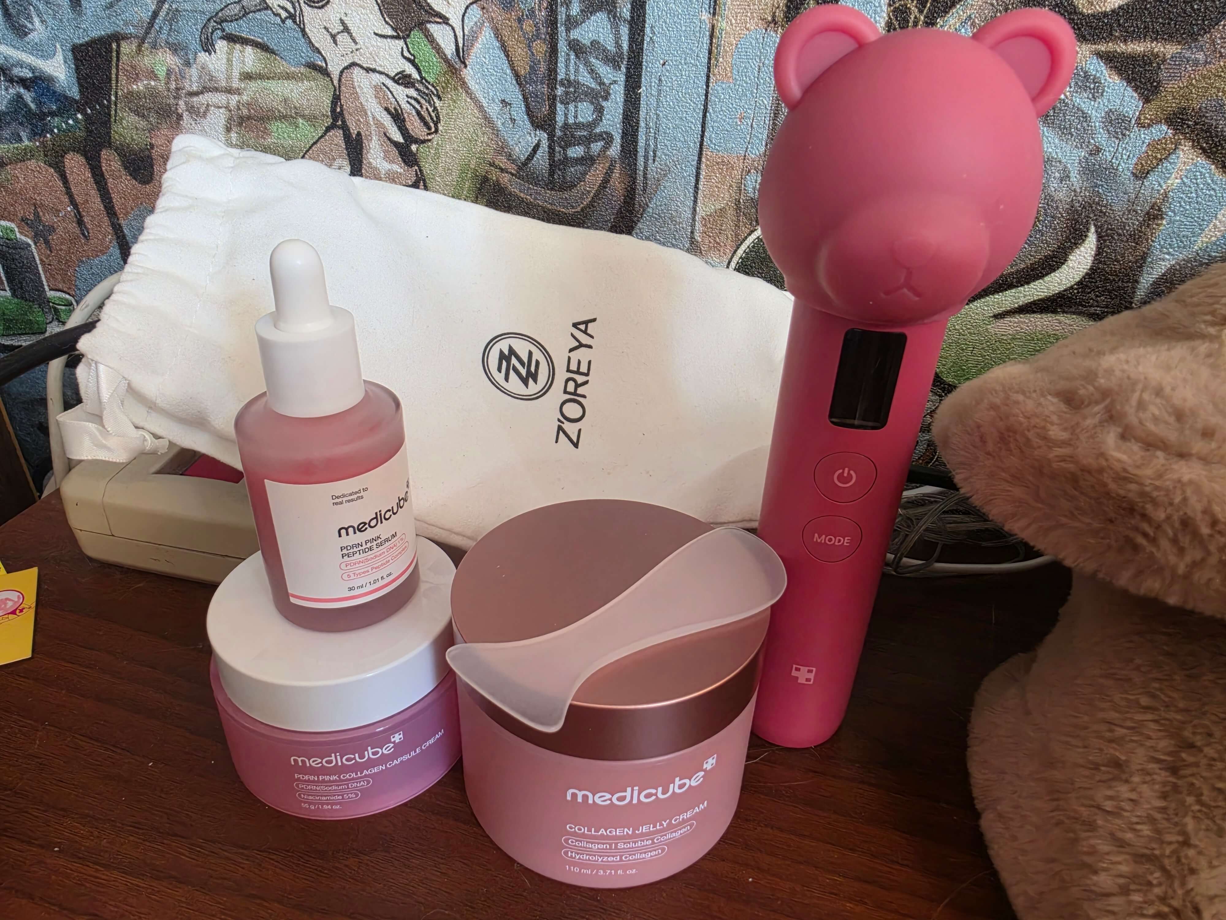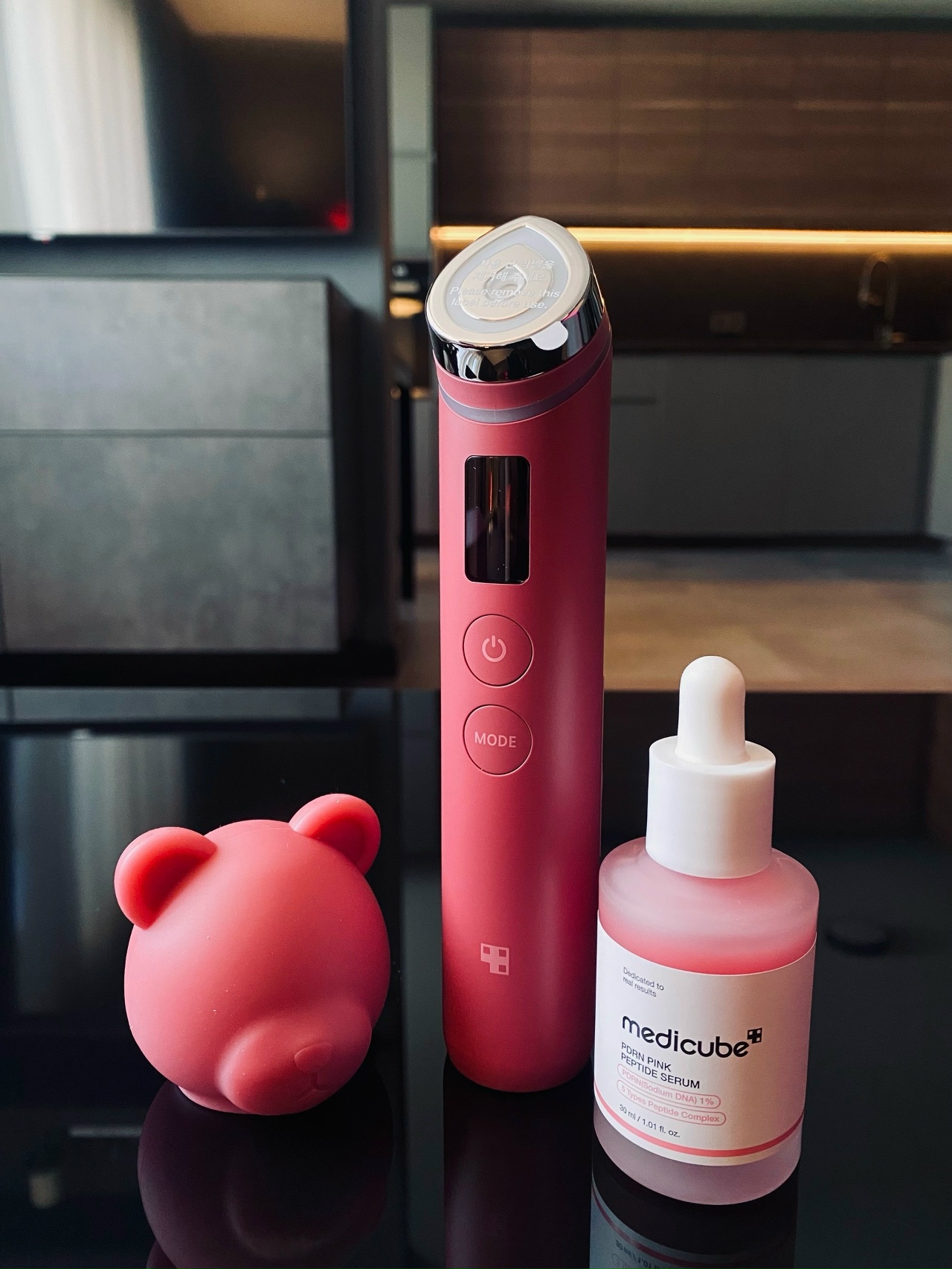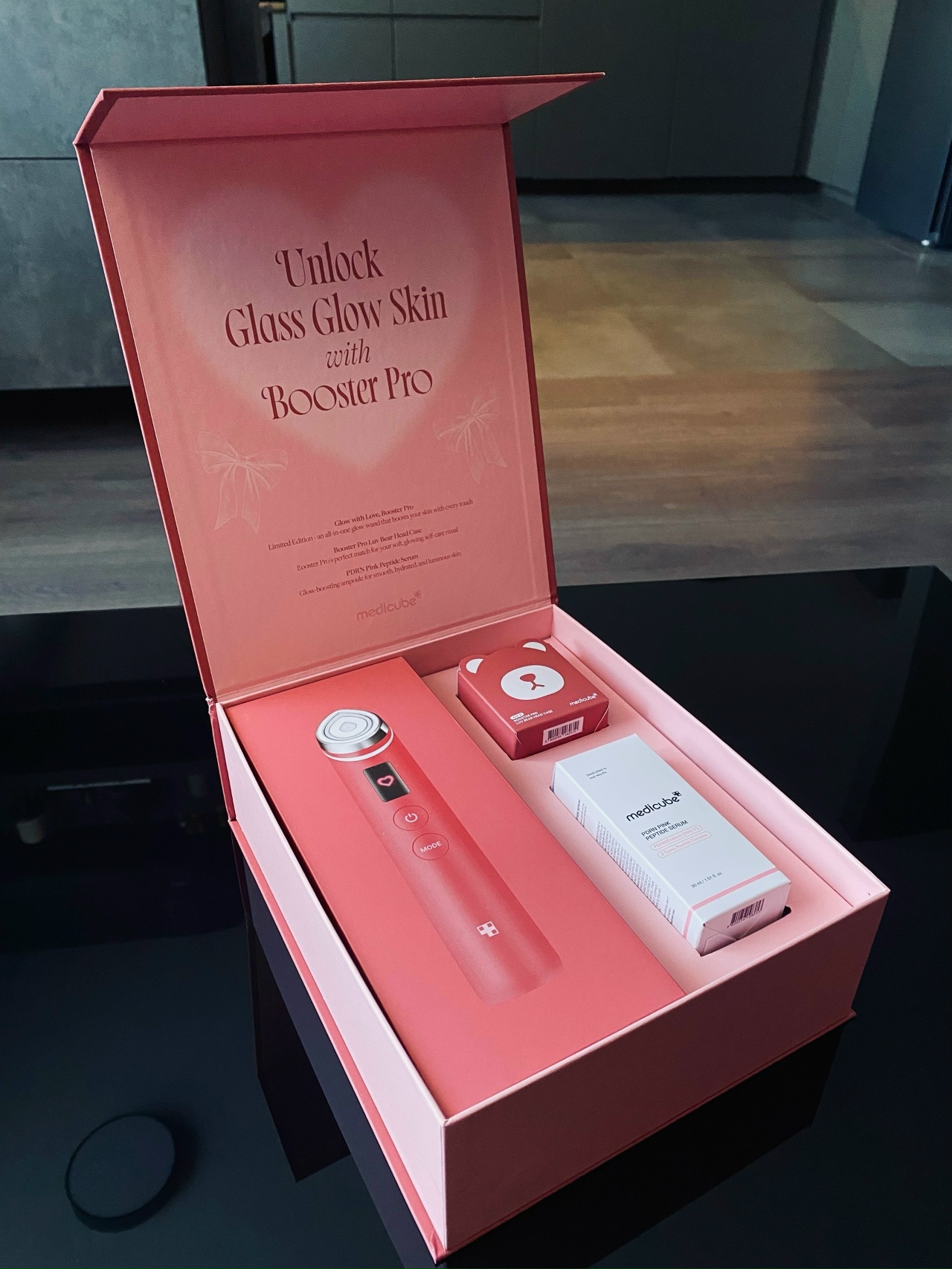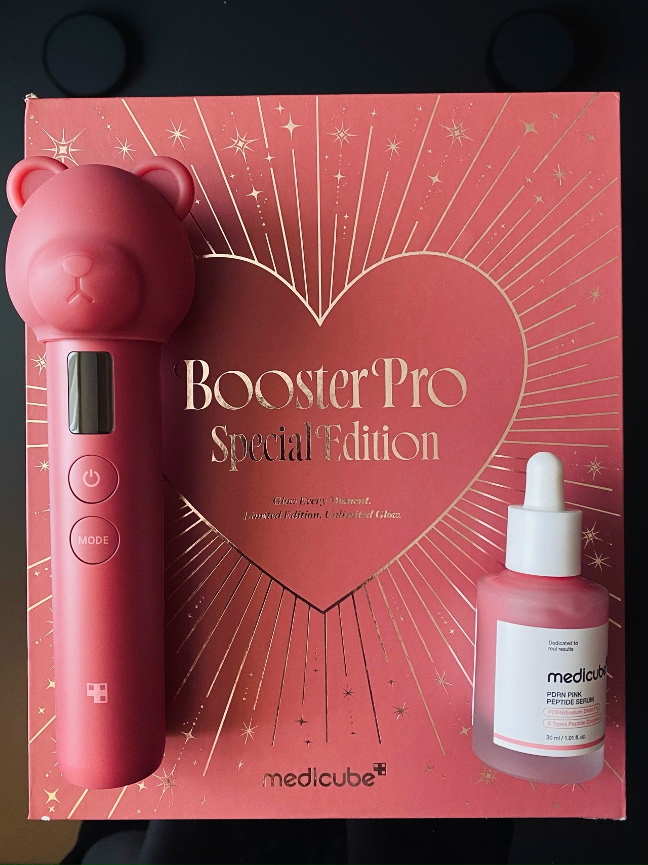 Содержит микротоковый аппарат и колпачок в форме медвежонка приглушённого красного оттенка, а также полноразмерную лифтинг-сыворотку с ПДРН. При включении на дисплее лимитированного гаджета появляется сердечко.