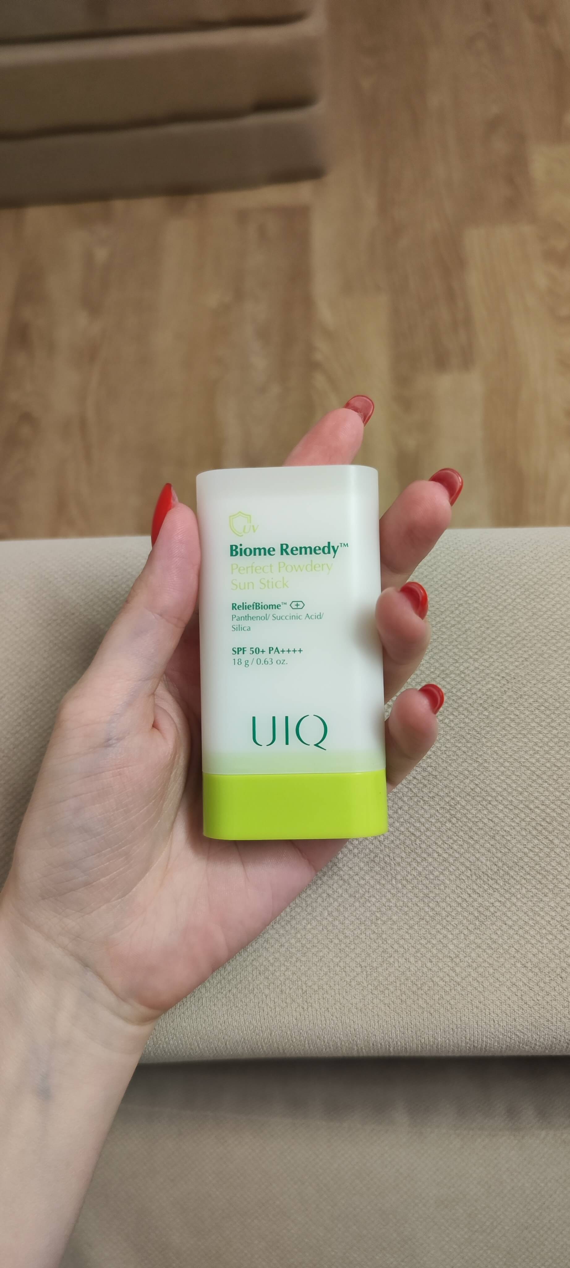 Пудровый солнцезащитный стик UIQBiome Remedy Perfect Powdery Sun Stick SPF 50+ PA++++ защищает от ультрафиолета, успокаивает кожу и оставляет приятный сатиновый финиш.