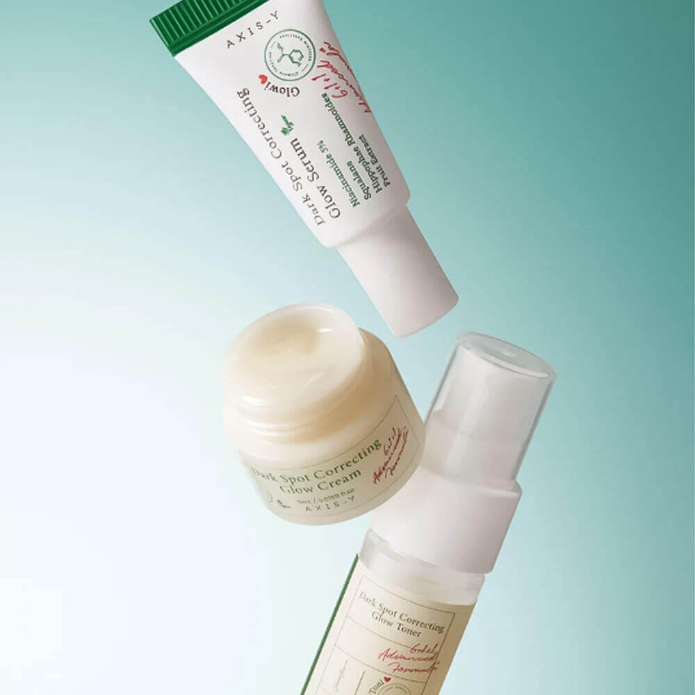 AXIS-Y Dark Spot Correcting Glow Toner: Water, Butylene Glycol, Niacinamide, Ethylhexyl Stearate, Caprylic/Capric Triglyceride, Cetyl Ethylhexanoate, Glutathione, Sodium Ascorbyl Phosphate, Salix Alba (Willow) Bark Extract, Adenosine, Sodium Hyaluronate, Hydroxypropyltrimonium Hyaluronate, Sodium Acetylated Hyaluronate, Hydrolyzed Hyaluronic Acid, Hyaluronic Acid, Sodium Hyaluronate Crosspolymer, Hydrolyzed Sodium Hyaluronate, Potassium Hyaluronate, Panthenol, Squalane, Glycerin, Allantoin, Cyanocobalamin, Terminalia Ferdinandiana Fruit Extract, Hippophae Rhamnoides Fruit Extract, Malpighia Glabra (Acerola) Fruit Extract, Brassica Oleracea Italica (Broccoli) Extract, Morus Alba Root Extract, Phaseolus Radiatus Seed Extract, Canavalia Gladiata Seed Extract, Glycine Soja (Soybean) Seed Extract, Lens Esculenta (Lentil) Seed Extract, Ceratonia Siliqua (Carob) Seed Extract, Centella Asiatica Leaf Extract, Ceramide NP, Acetyl Octapeptide-3, Dipeptide-1, Tripeptide-2, Palmitoyl Dipeptide-7, Dipeptide-4, Sorbitan Stearate, Cetearyl Alcohol, 1,2-Hexanediol, Stearic Acid, Polysorbate 60, Ethylhexylglycerin, Hydrogenated Olive Oil Unsaponifiables, Disodium EDTA, Hydroxypropyl Cyclodextrin, Pueraria Lobata Root Extract, Lactobacillus Ferment Lysate, Chlorphenesin, Maltodextrin, Melia Azadirachta Flower Extract, Ocimum Sanctum Leaf Extract, Melia Azadirachta Leaf Extract, Arginine, Phytosterols, Carbomer, Curcuma Longa (Turmeric) Root Extract, Corallina Officinalis Extract, Caprylyl Glycol, Sodium Citrate, Polyglyceryl-10 Laurate, Citric Acid.